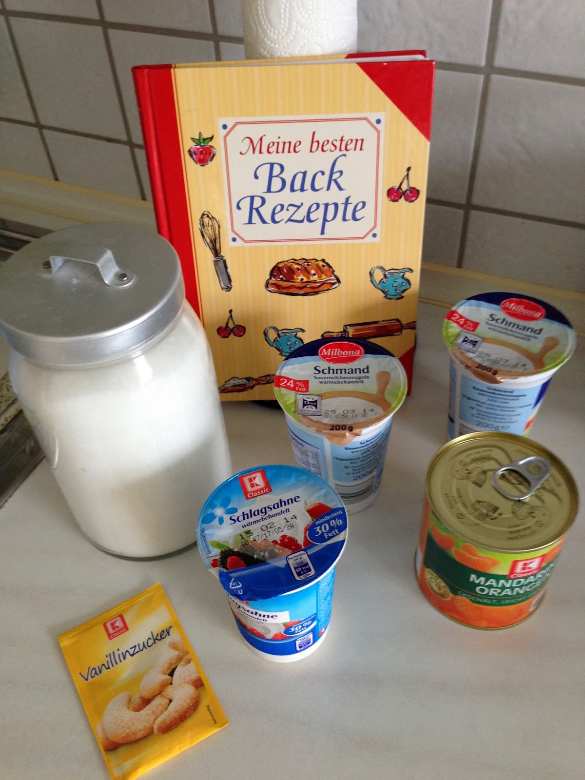 In der Zwischenzeit bereitet ihr die Mandarinen Pfirsich Schmand Masse vor. Folgende Zutaten benötigt ihr (nicht wundern, auf dem Foto fehlen die Pfirsiche):