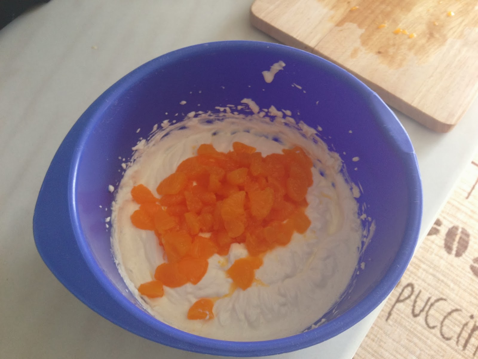 Zunächst verrührt ihr den Schmand mit den 4 Teelöffeln Zucker. Dann lasst ihr die Mandarinen und die Pfirsiche abtropfen und schneidet sie in kleine Stücke.