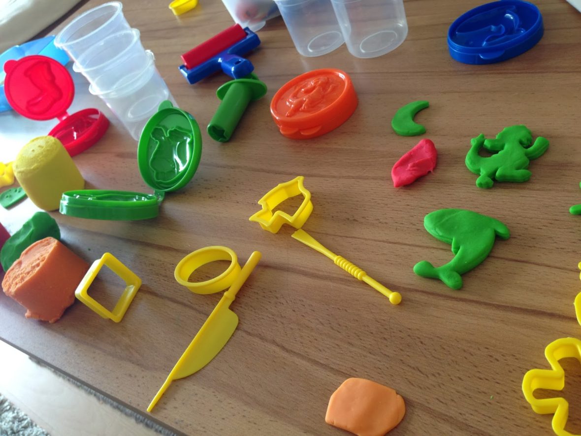 An Play Doh Sets haben wir die Grundausstattung wie Förmchen, kleine Werkzeuge, die Presse, die "Würstel-Sternchen-und-sonstige-Schlangen-Form-Presse" (Du meine Güte, wie heißt das Ding?!!!) und fügen auch gerne noch Alltagsgegenstände wie Flaschendeckel, Holzrollen usw. hinzu, die immer wieder neue Möglichkeiten bieten.