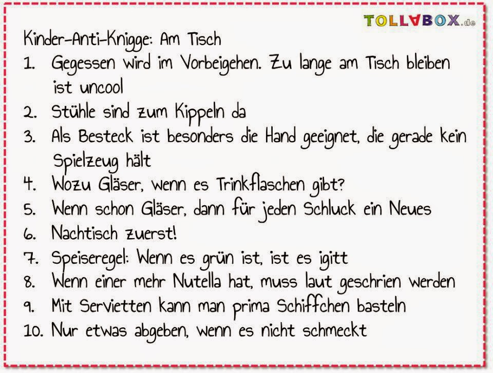 Ich fand das so wahr und witzig, dass ich mal darüber nachgedacht habe, wie das bei uns zuhause beim Essen so abläuft. Es wird einem ja von Anfang an eingetrichtert, dass man dem Kind beim Essen Manieren beibringen soll. Jut. Versteh ick! Das Essen muss ja nun auch nicht durch die Küche fliegen und mit dem ganzen Gesicht sollte man sich jetzt auch nicht unbedingt in die Nudeln stürzen.