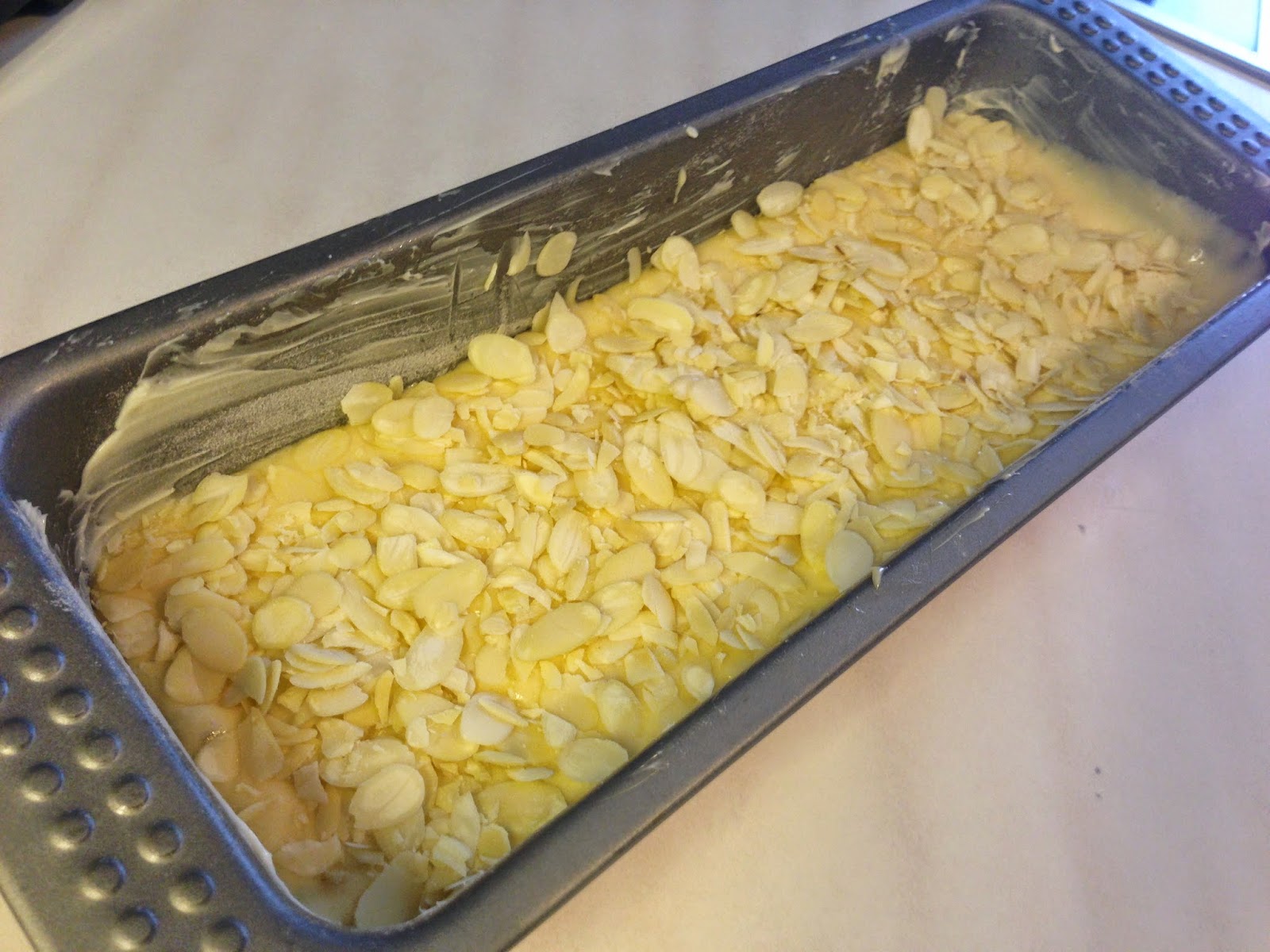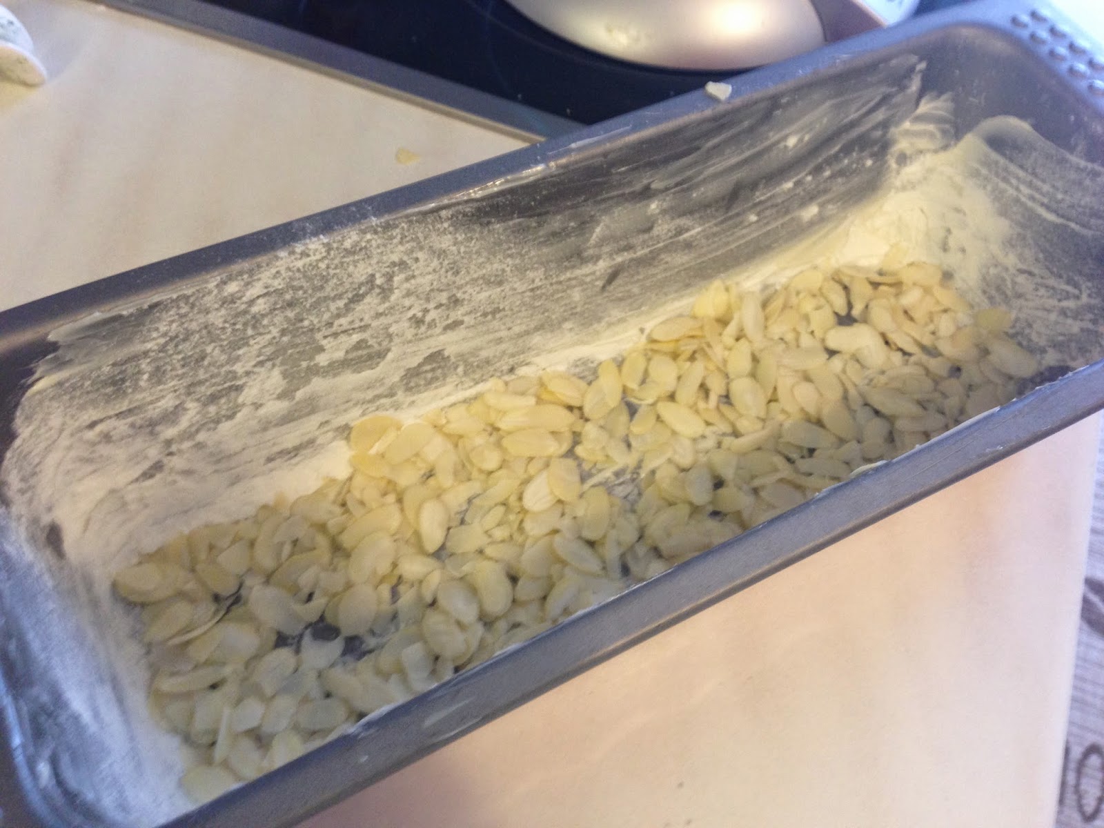 Als erstes fettest du die Kastenform mit Butter ein und bestäubst sie mit Mehl. Das überschüssige Mehl hauste wieder aus der Form raus. Dann streuste die Hälfte der Mandelblättchen (60g – 30g = 30g) gleichmäßig auf den Boden der Form.