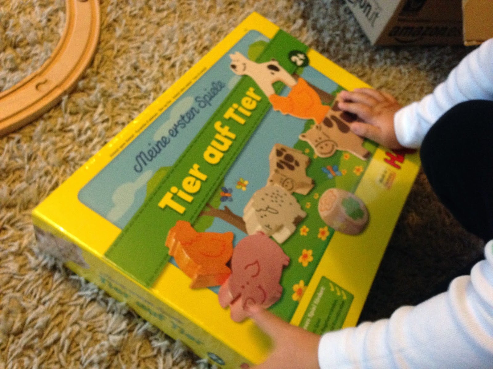 Zum 2. Geburtstag hat der Mini Chef dann von Opa Paul das Haba Spiel „Tier auf Tier“ geschenkt bekommen. Das hat sich relativ einfach angehört und ich dachte mir, selbst wenn der Mini Chef das Spiel an sich jetzt nicht spielt, kann er wenigstens mit den Holztieren spielen. Ich möchte euch jetzt nicht mit Einzelheiten langweilen. Ich kann nur so viel sagen, richtig gespielt haben wir mit dem Spiel nicht. Der Mini Chef is total von den Holztieren und den Pappbildern fasziniert. Er spielt auch damit, aber wir spielen das Spiel halt nicht so, wie es in der Beschreibung steht.