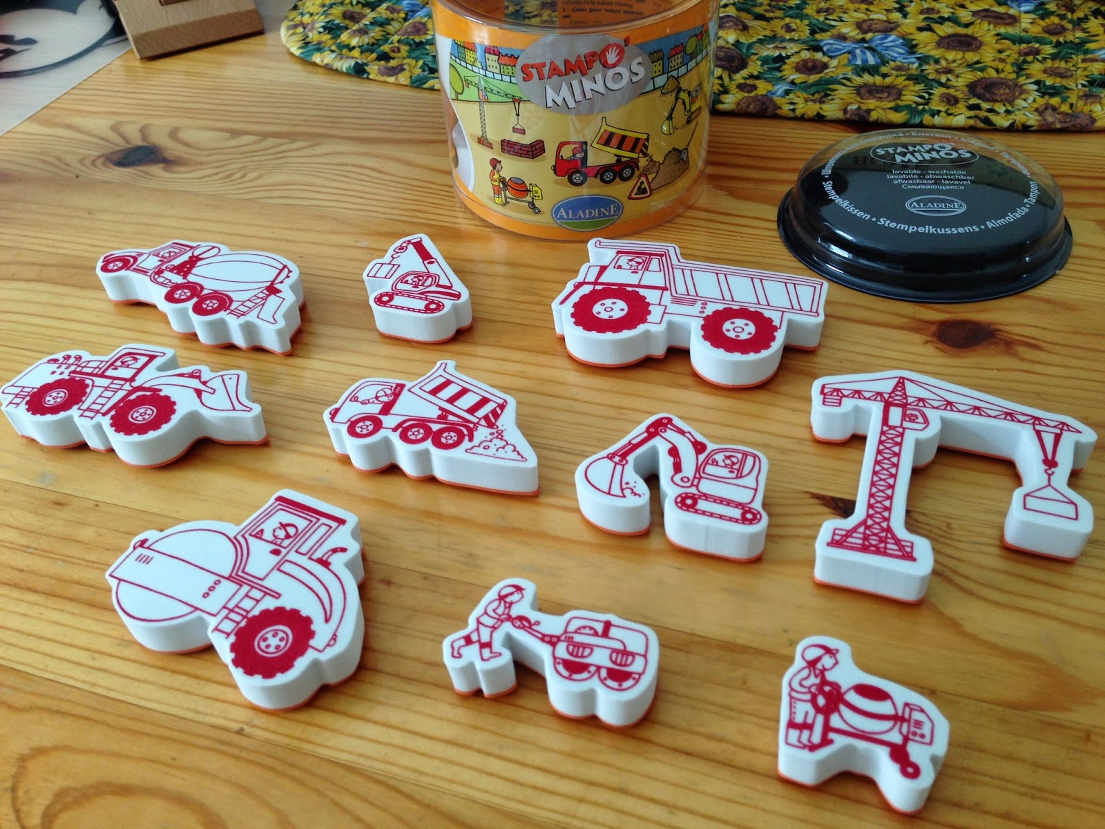 Und zwar kommen dann unsere neuesten Modelle zum Einsatz: Die Baustellen Stempel. Das Set ist von der Marke AladinE und besteht aus 10 unterschiedlich großen Stempeln und einem Stempelkissen. Ich muss gestehen die ganz großen Stempel passen wirklich gerade so auf das Stempelkissen. Aber es geht.
