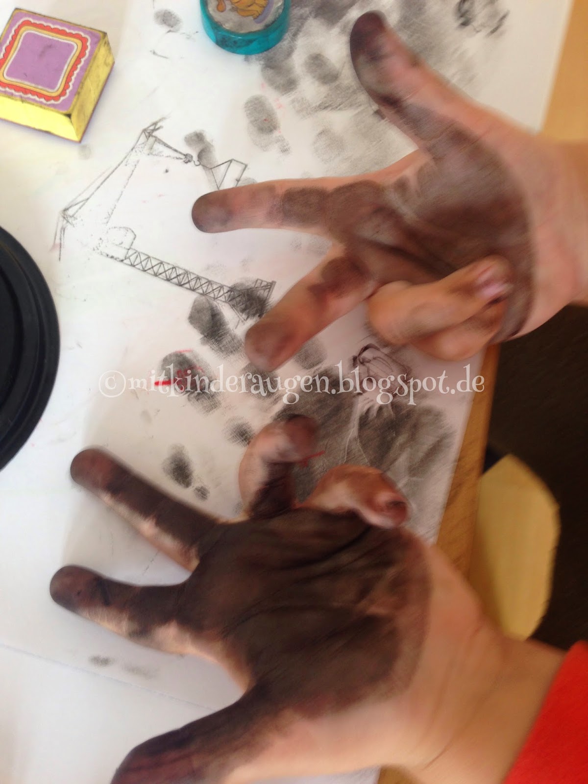 Mit Kinderaugen betrachtet, muss man genauso aussehen, wenn man stempelt. Zum Glück ist das abwaschbare Farbe. Am Ende hatte ich nämlich auch die Sachen und mein Gesicht damit voll.