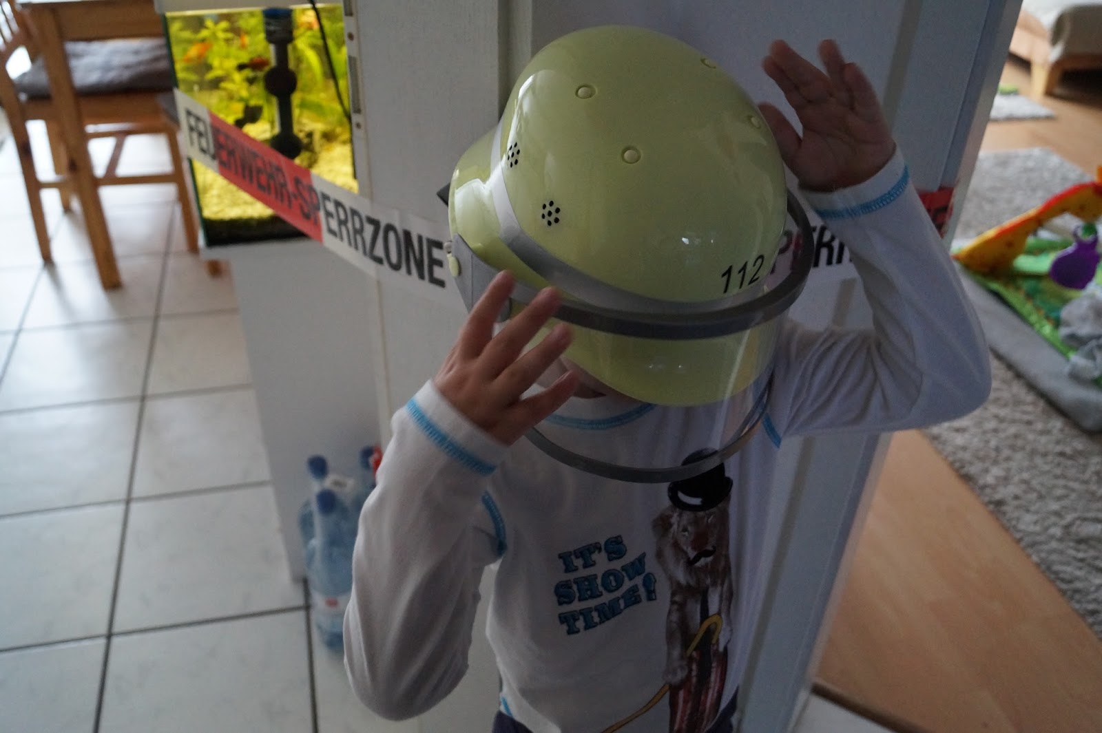 Der Feuerwehrhelm wird aufgesetzt und es werden einige Großbrände in der Wohnung gelöscht.