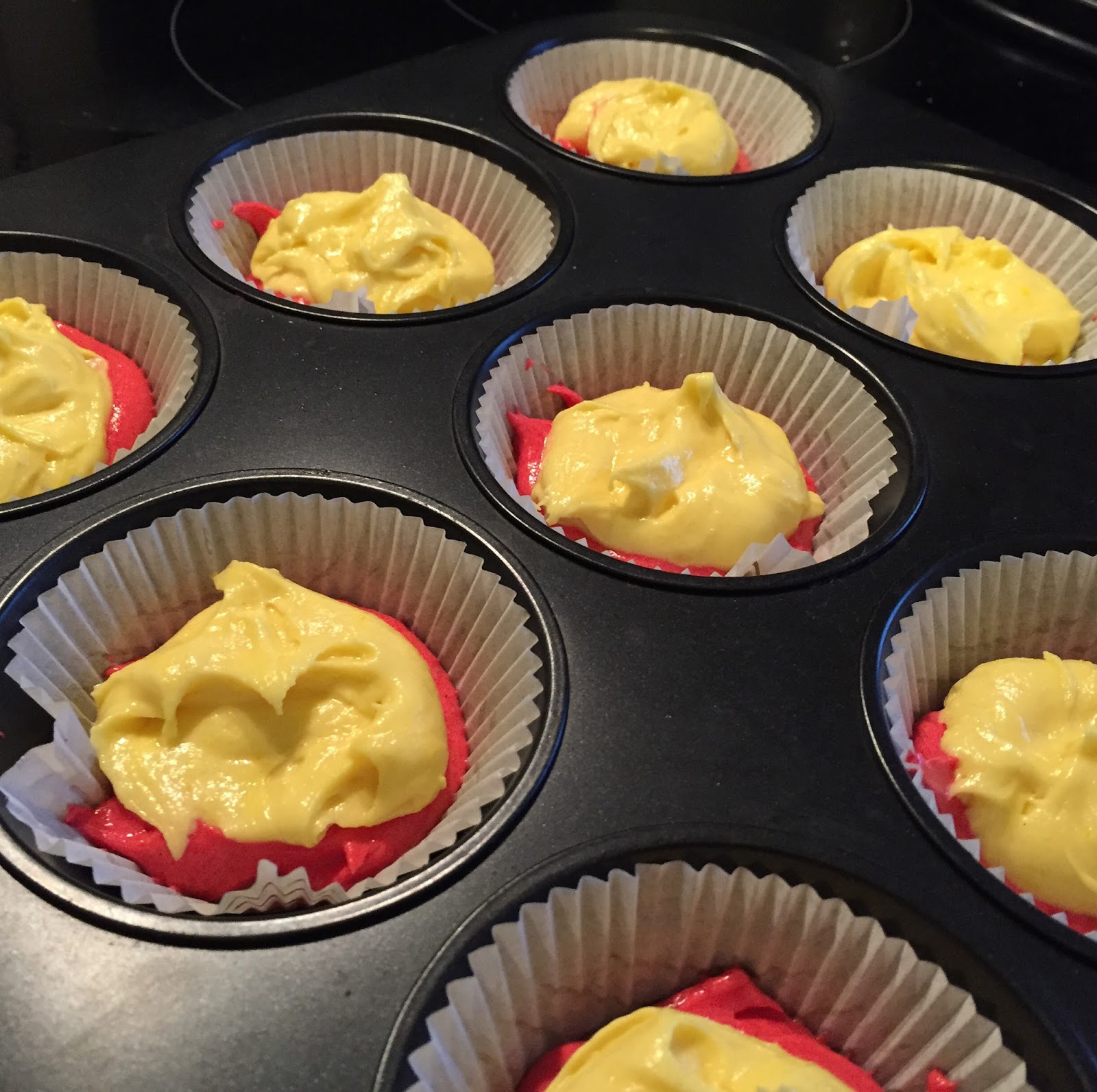 Wir backen rot gelbe Feuerwehr Muffins für Sonntag.