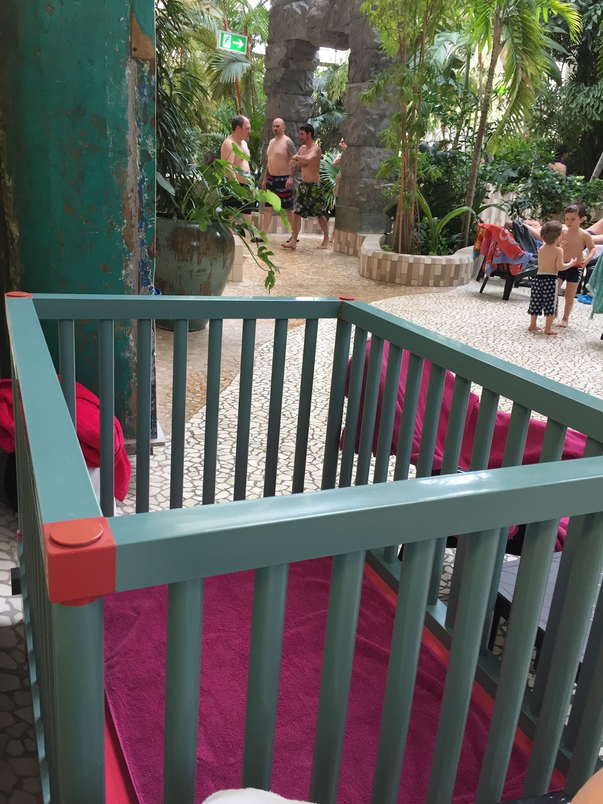 Und wieder geht’s ins Aqua Mundo. Was ich übrigens richtig gut finde ist, dass es in der Badelandschaft ganz viele Wickeltische und Laufgitter gibt. Wir nehmen uns ein Laufgitter indem die Mini Chefin entspannt liegen und spielen kann.