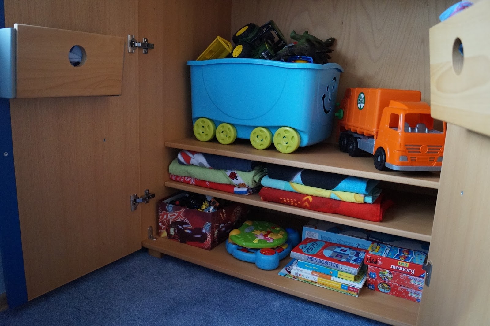 Spielsachen selbstständig rausholen und wieder einräumen. Beziehungsweise