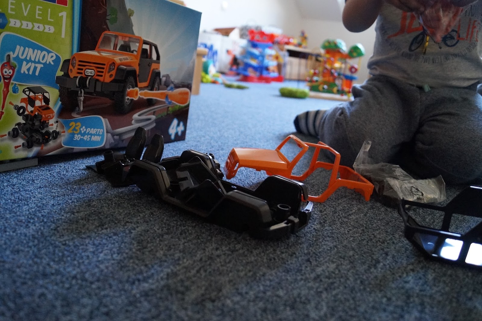 Die Junior Kit Reihe passt also perfekt und dann dreht sich dabei auch noch alles um Autos. Da schlägt das Herzchen vom Mini Chef höher. Und meins auch, denn ick habe es schon erwähnt: Zusammenbauen ist für mich wie Yoga. Ick brauche nur ne klare Anleitung und dann läuft dit. Die klare Anleitung liegt den Junior Kit Produkten natürlich bei. Außerdem gibt es ein zum Patent angemeldetes Schrauben-System, das ein Zusammenbau ganz ohne Kraftaufwand ermöglicht. Und wat soll ick sagen? Die Sets sind super. Der Mini Chef hat sich alles angeguckt, und fing mal direkt anzubauen. Ohne Anleitung. Ick dann so „Stoooopppppp. Erstmal gucken wie das geht!“ Kinder wissen aber was sie tun und man sollte sie nicht unterschätzen, denn der Mini Chef hat mal eben rucki zucki losgelegt.