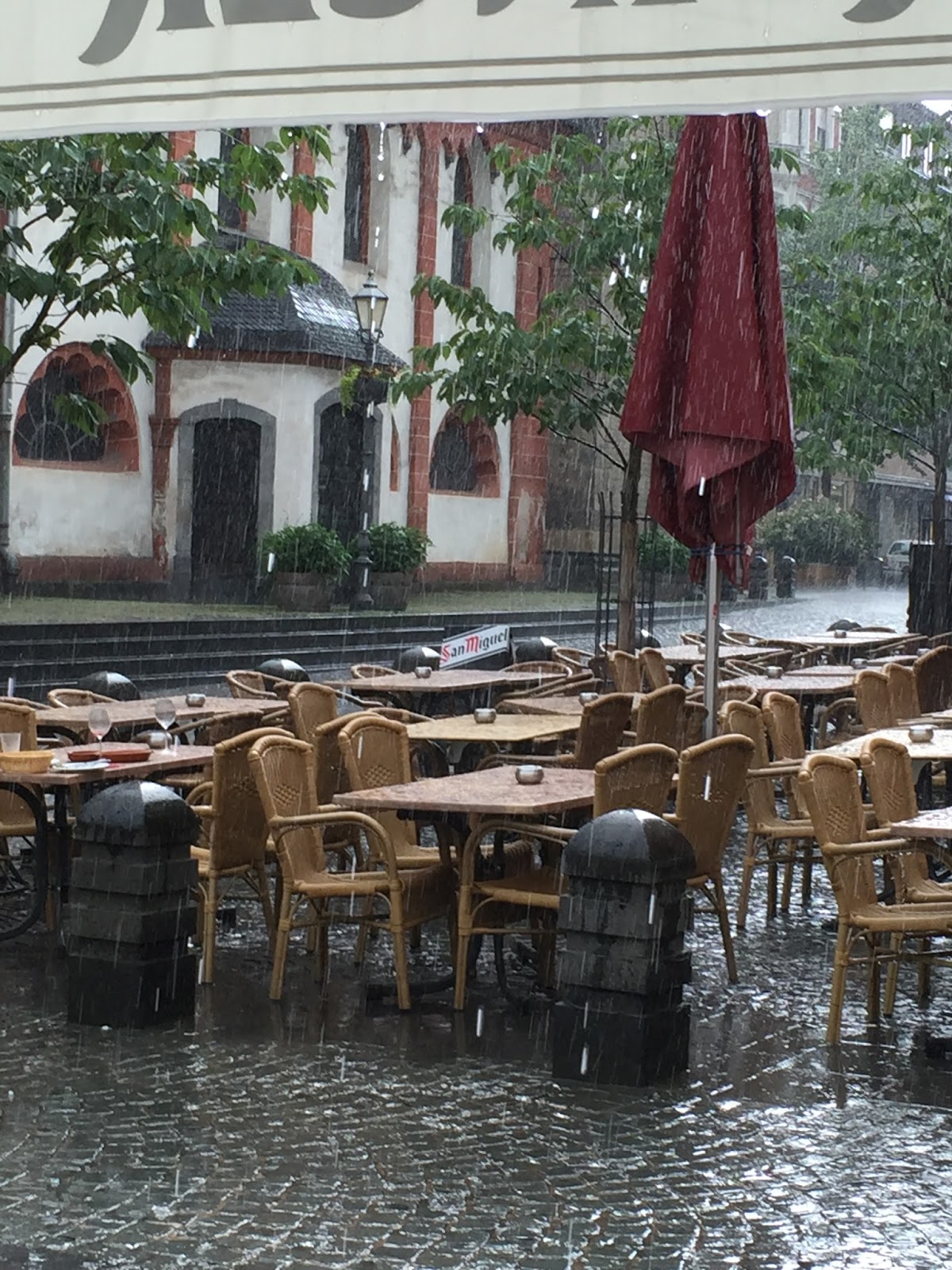 Wir fahren nach Koblenz, denn der Mini Chef möchte unbedingt seine Liebfrauenkirche sehen. Wir kommen gerade an, als es wie aus Eimern beginnt zu gießen. Also erstmal Schirmidylle.