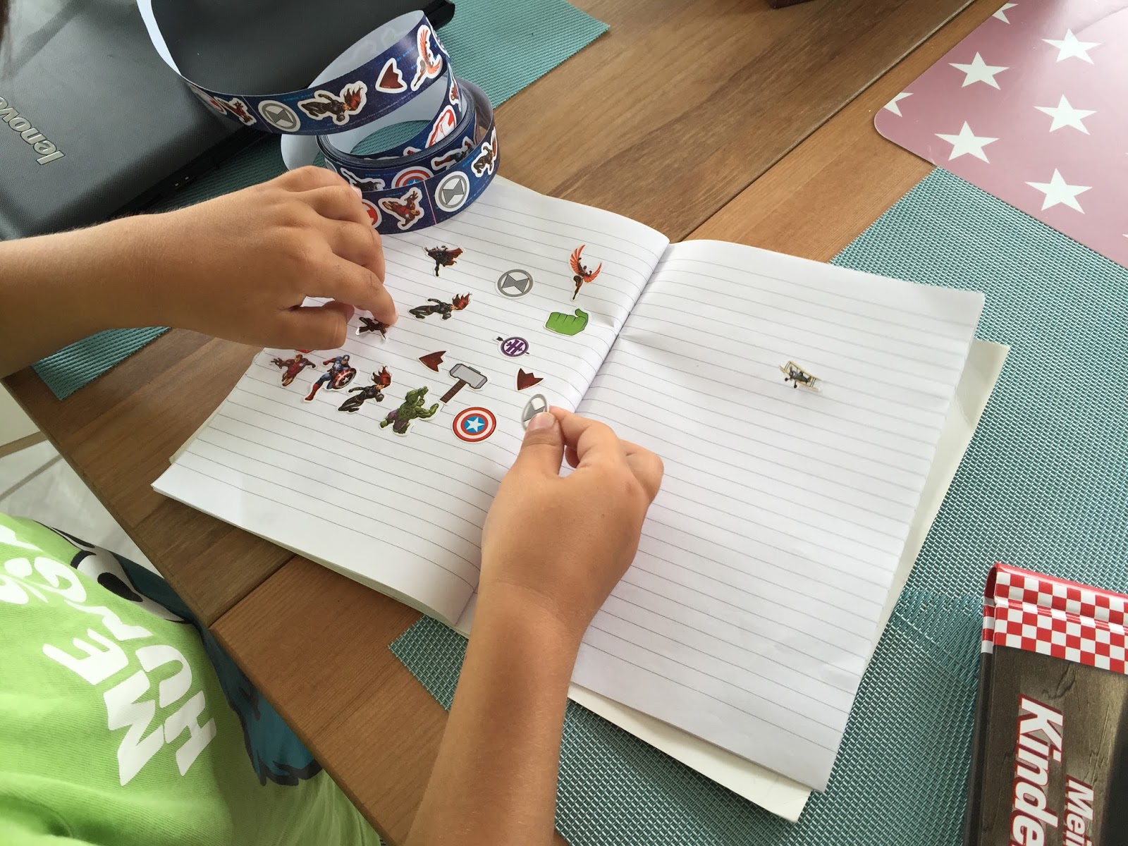 Es werden Sticker eingeklebt. Superhelden Sticker.