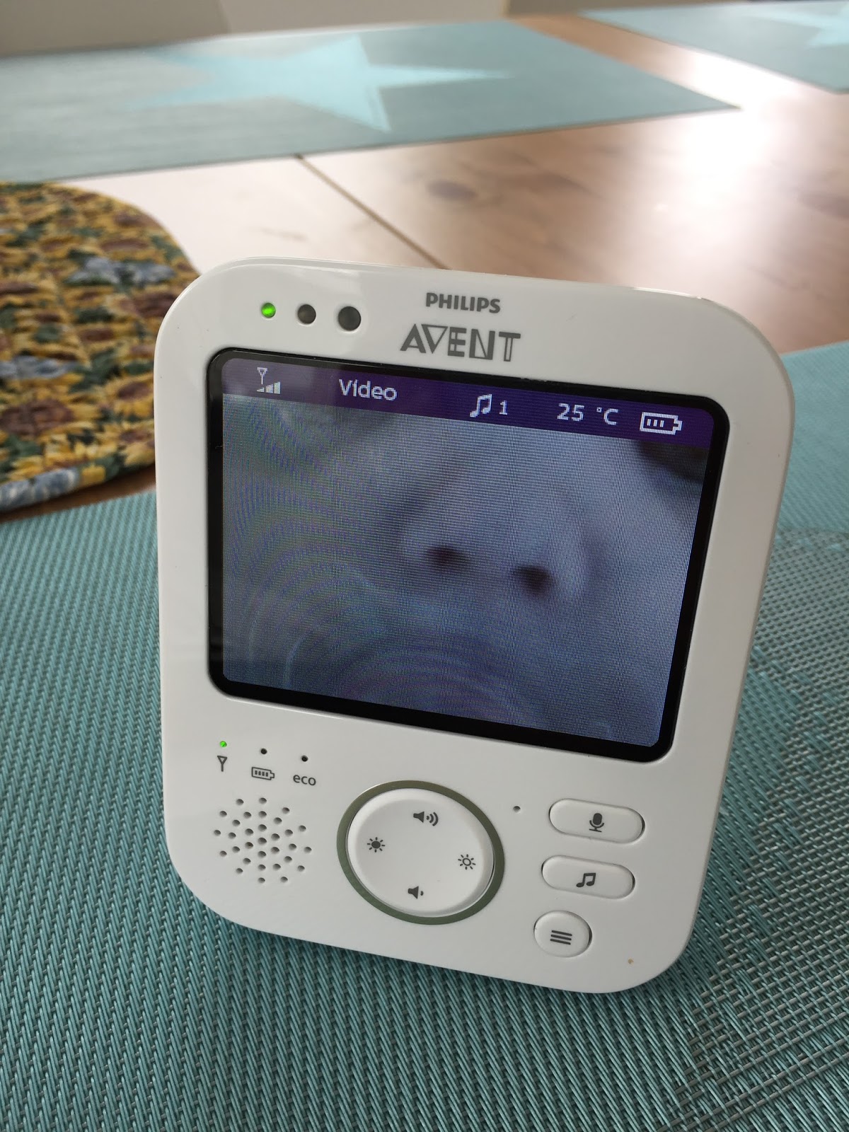 Und so sieht es aus, wenn das Kind wach ist und fasziniert mit der Kamera vom Babyphone spielt.