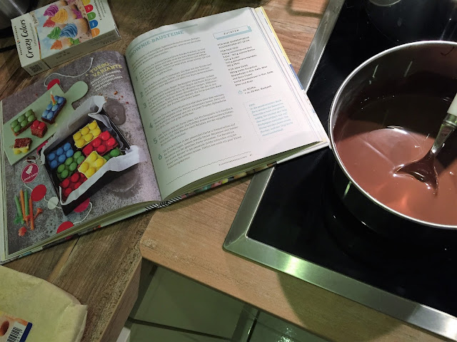 Färbt die einzelnen Gussportionen in der gewünschten Farbe ein. Bitte nehmt hochwertige Lebensmittelfarbe dafür. Die von Wilton ist gut. Einfach mal googeln. Gibt es online zu kaufen. Wir hatten zunächst mit Crazy Colors angefangen. Das ging gar nicht und wir haben mit Wilton weitergemacht.
