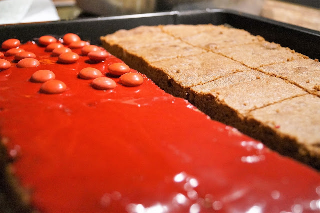 Und legt die Schokolinsen drauf, Wir hatten immer vier Linsen pro Stück Kuchen. Das reicht aus. Ihr könntet aber auch sechs Schokolinsen nehmen oder acht. Wie ihr wollt.