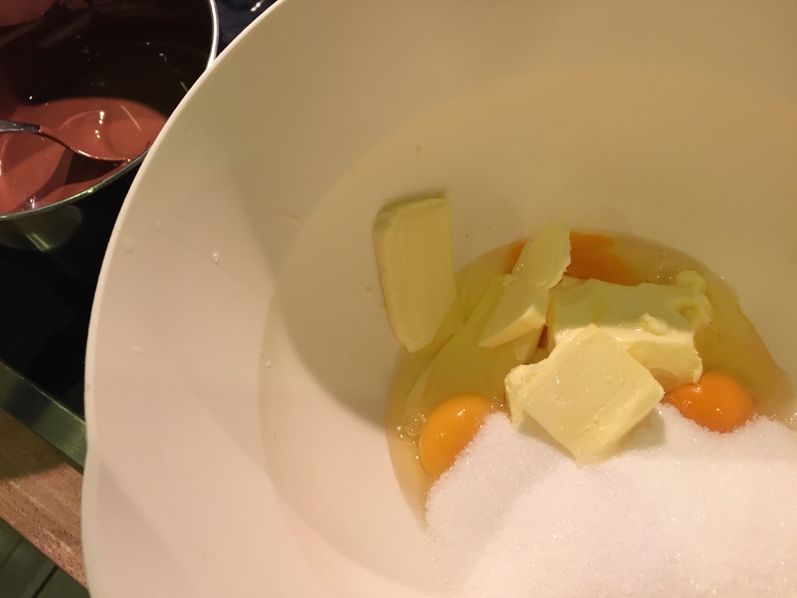 Den Backofen auf 180 Grad Ober- und Unterhitze vorheizen. Die Eier mit der Butter und dem Zucker schaumig rühren, Dann die geschmolzene Kuvertüre unterrühren.