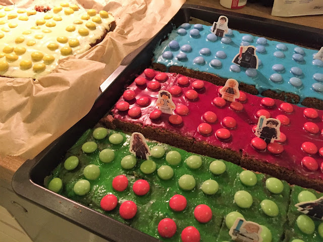 Die Krönung des Ganzen war unser Lego bzw. Baustein Kuchen. Rucki zucki gebacken. Nur das Verzieren dauert ein wenig, aber auch nicht übermäßig viel. Den Lego Kuchen hatte ich für den Kindergarten gebacken. Verziert mit ein paar essbaren Oblaten im Lego Star Wars Stil kamen sie super bei den Kids an und der Mini Chef hat früh an seinem Geburtstag Bausteine gestaunt. Spitzen Wortspiel, oder? 😉