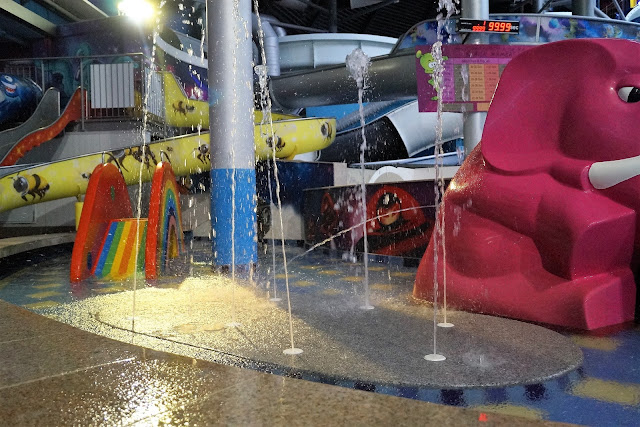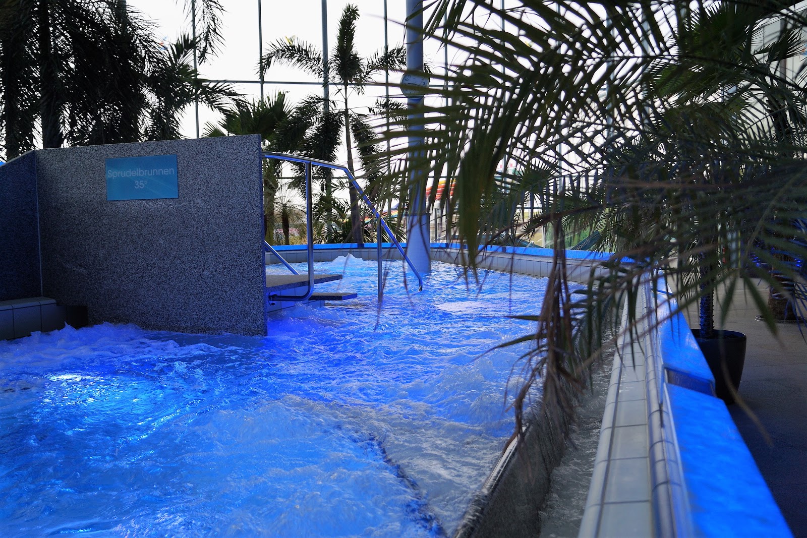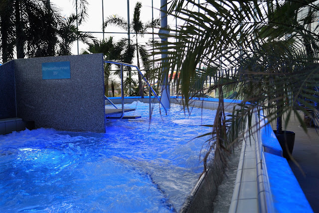 Er war am liebsten im Wellenbad. Was ich verstehen kann, denn dort ist es herrlich. Die Mini Chefin fand den 35 Grad warmen Sprudelbrunnen am coolsten. Sie hat dann immer ihre Händchen ins Wasser getaucht und konnte es wahrscheinlich gar nicht fassen, was da für Blubberblasen hochkommen.