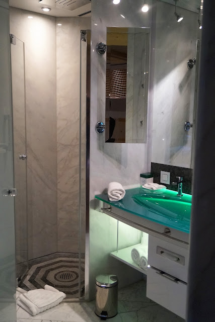 Wir waren in der Kapitäns-Kabine untergebracht. Das Zimmer kann mit bis zu sechs Personen belegt werden und ist ca. 34 Quadratmeter groß. Es ist komplett mit Holz vertäfelt und bietet einen tollen Blick auf das Wellenbad mit den über 300 echten Palmen (das Glasdach über dem Wellenbad kann übrigens geöffnet werden).