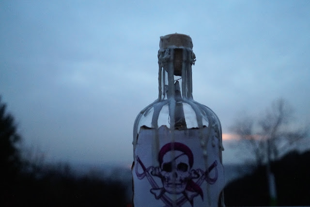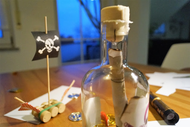 Kurze Vorgeschichte. Anfang Januar war der Mini Chef zum Piratengeburtstag von seinem besten Freund eingeladen. In der Einladung stand „Bitte schicke mir eine Flaschenpost, ob du dabei bist!“ Diesen dezenten Hinweis am Ende der Einladung hatte ich gekonnt überlesen. Nicht so der große Chef. „Wenn einer ne Flaschenpost von uns möchte, dann bekommt er ne Flaschenpost!“ Sprach er und verschwand mit Flasche, Kerze und diversen anderem Gedöns im Esszimmer und kam mit diesem Ergebnis wieder raus….