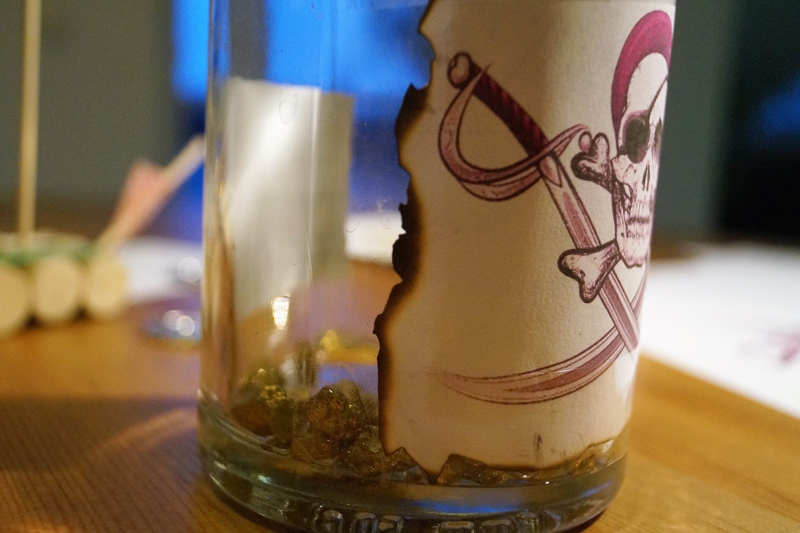 Wer möchte kann dann noch ein paar kleine Goldsteine in die Flasche schütten oder Piratengold oder kleine Münzen oder ähnliches. Auch hier sind der Fantasie keine Grenzen gesetzt. Wir haben kleine Goldsteine rein getan.