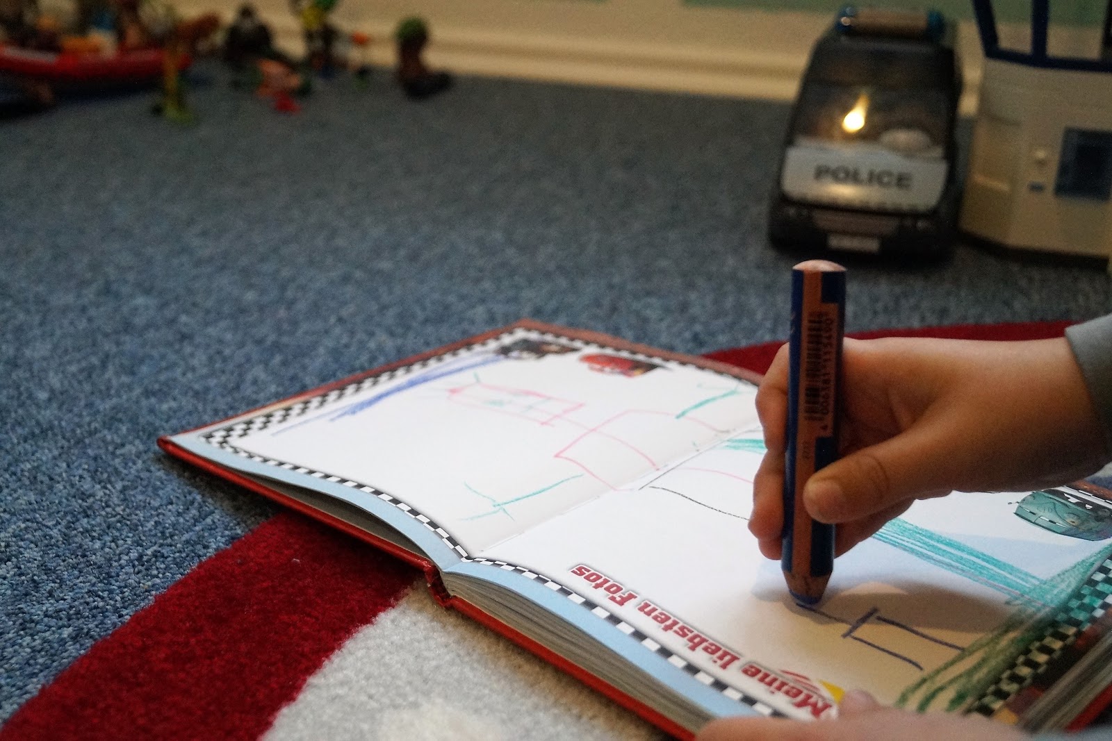 Der Mini Chef und ich sind Sonntag zeitig wach. Wir malen und tragen ins Freundebuch ein.