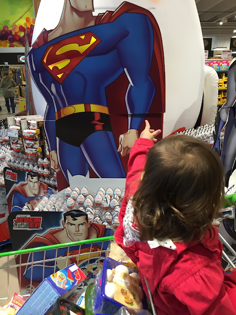Nachmittag fahre ich mit der Mini Chefin den Wochenendeinkauf erledigen. Die Jungs bleiben zuhause. Die Mini Chefin ist auch von den Superhelden Ü-Eiern begeistert. Sie kennt die Figuren natürlich alle von ihrem Bruder.