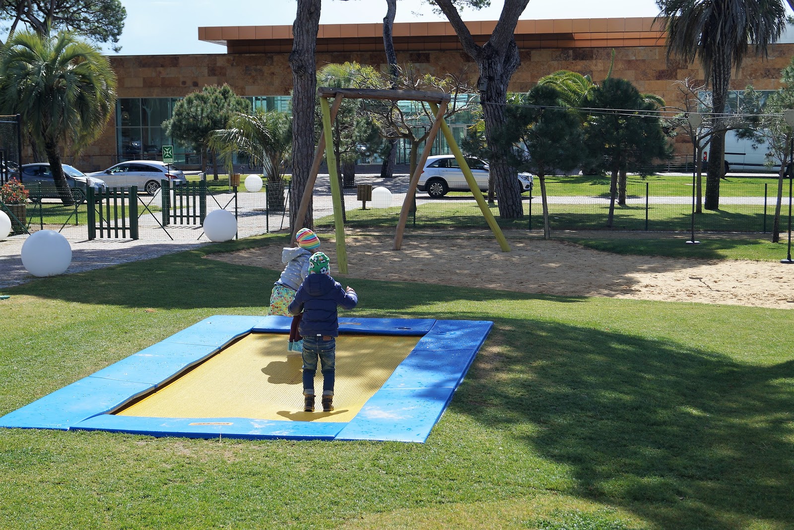 Auf dem riesigen Spielplatz bleiben wir erstmal ne ganze Weile hängen. Wir hüpfen…