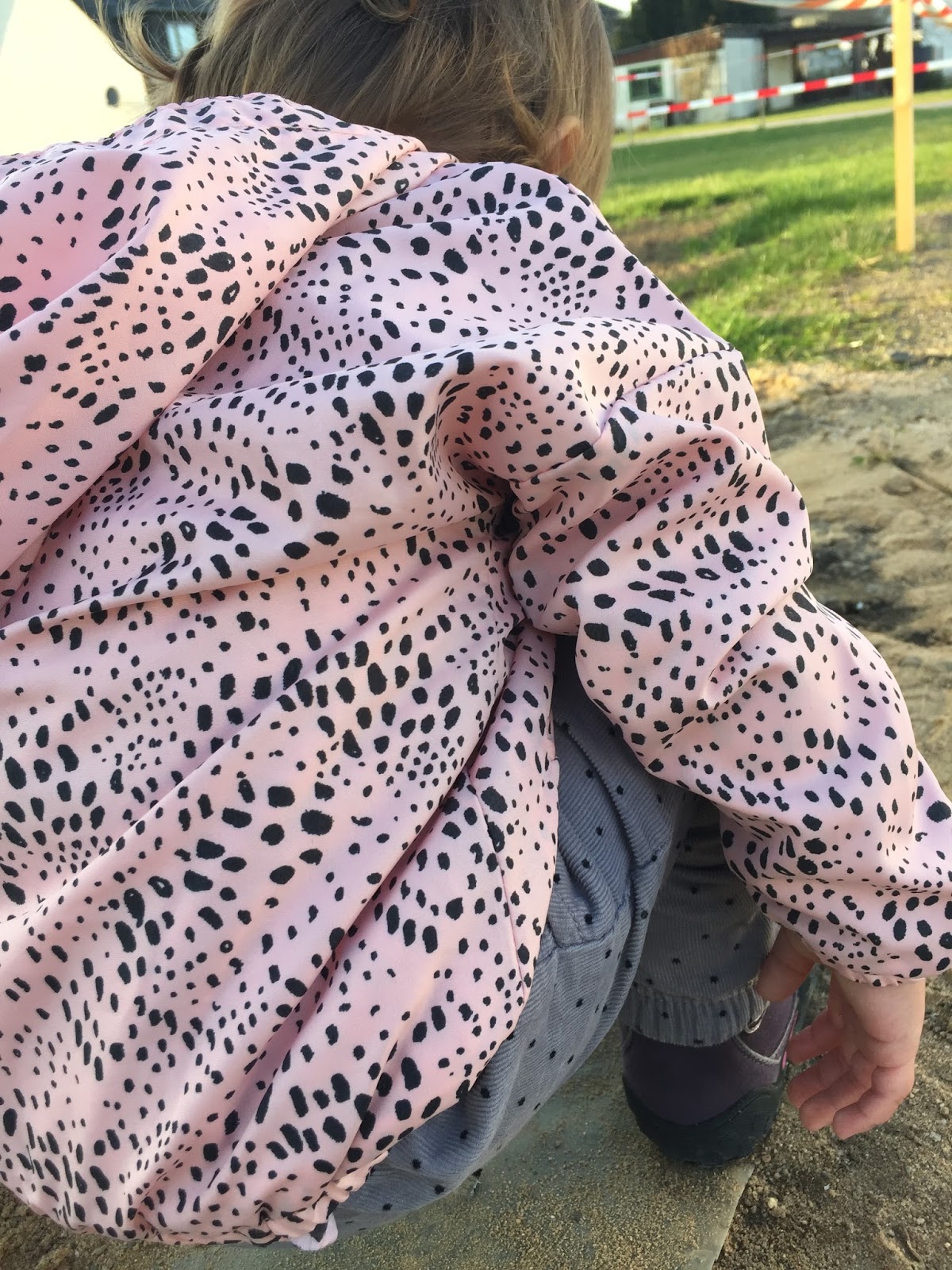 Die Mini Chefin ziehen wir ja auch eher sportlich an. Das hat den Grund: Das Shorts, Leggins oder Hose beim Toben und Spielen einfach praktischer und unkompliziertes sind, als Rock und Kleid. Ihr Tumble `N Dry Outfit besteht aus der Rotorura Hose in olive, dem Onerora Shirt in einem zarten rosa Ton und der Dolce Jacke auch in rosa mit Dalmatiner Druck.