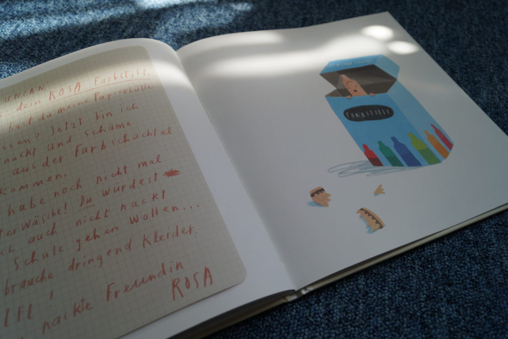 Und sogar Rosa hat einen Grund, sich zu beschweren. Seine Papierhüle ist abgerissen. Er ist jetzt also nackt und traut sich nicht aus der Schachtel heraus. Was Duncan tut, um all seine Farbstifte wieder glücklich zu machen, müsst ihr selber herausfinden. Ein zauberhaftes Buch für Kinder ab vier Jahren und es kostet 16€.